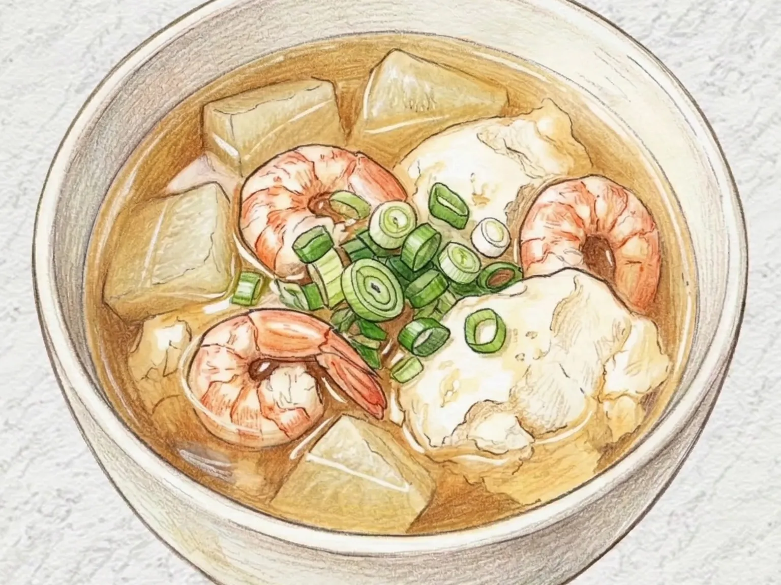Yeondubu-saeu-guk es una sopa coreana clara donde el caldo de anchoas y algas, el rábano y los camarones proporcionan el sabor, y el tofu suave añade un contraste cremoso. El rábano se cocina a fuego lento durante ocho minutos para liberar su dulzor natural, luego los camarones pelados y limpios se cocinan durante tres minutos, aportando un sabor a mar limpio sin pesadez. El tofu suave se añade con una cuchara al final y se calienta por solo dos minutos para que se mantenga intacto y sedoso. La cebolleta y un toque de sal cierran el sazón, dejando un tazón suave y reconfortante que funciona bien como una comida ligera o junto a platos más pesados.