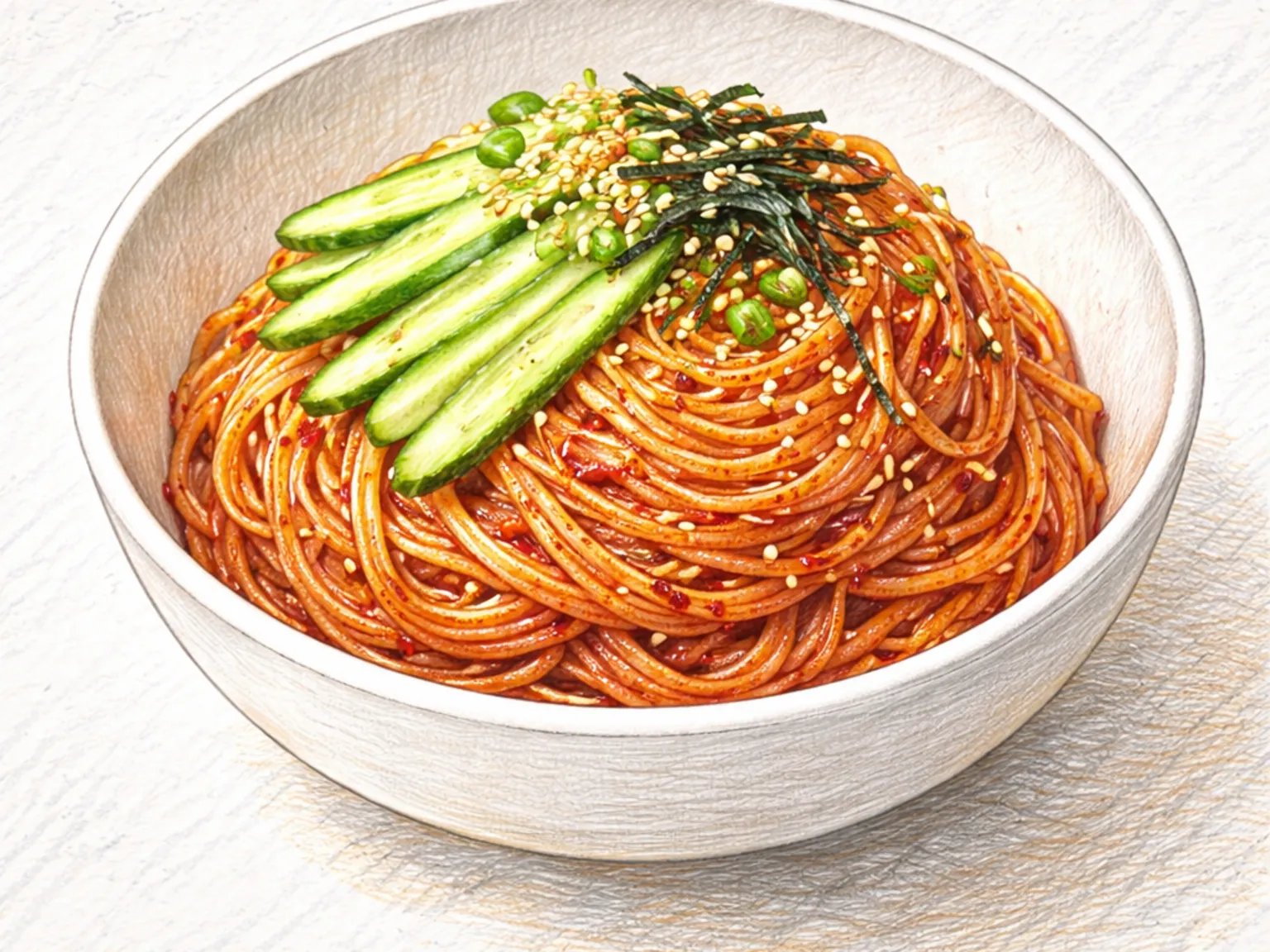 ビビングクスは茹でて冷水ですすいだソミョンにコチュジャン、唐辛子粉、梅シロップ、酢、醤油、ごま油を混ぜたヤンニョムジャンを和えて食べる麺料理です。コチュジャンの辛味と梅シロップの甘み、酢のさわやかな酸味が重なり合い、一口で複合的な味わいが広がります。ソミョンは冷水で十分にすすいでこそでんぷんが落ちて弾力のある食感が活き、ヤンニョムが麺にまんべんなく絡みます。レタスときゅうりの千切りを最後に軽く混ぜるとシャキシャキとした食感が加わり、野菜の水分がヤンニョムを適度にほぐしてくれます。ヤンニョムが濃すぎるときは茹で汁大さじ1で濃度を調整します。