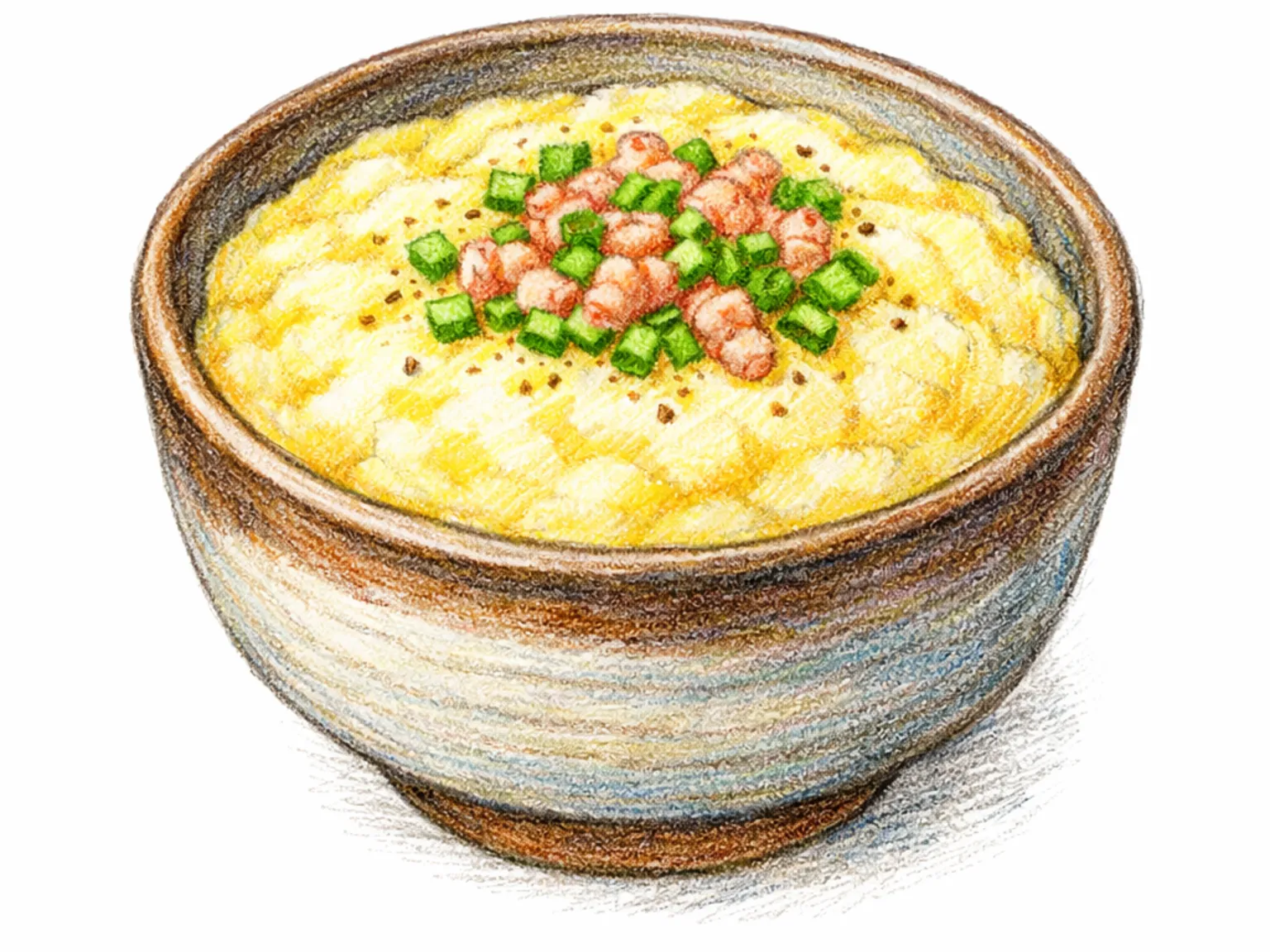 ケランチムは、卵をいりこだしとアミの塩辛で溶いて、トゥッペギ(石鍋)で弱火にかけてじっくり蒸し上げた韓国式の卵料理です。いりこだしが旨味のベースを作り、アミの塩辛が程よい塩気を加えるため、別途の調味料なしでも深い味わいになります。弱火で蓋をして蒸すと気泡のないふわふわでなめらかな食感に仕上がります。にんじんと長ねぎが彩りを添え、仕上げにかけるごま油とごまが香ばしい風味を加え、老若男女に愛されるおかずです。