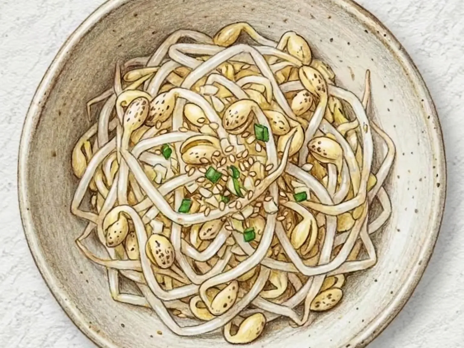 コンナムルムチムは、韓国の家庭のおかずの中で最も高い頻度で食卓に上がる料理の一つで、茹でた大豆もやしをごま油・にんにく・塩で和えた基本のナムルです。調理中に絶対蓋を開けてはいけないというルールが有名ですが、沸騰したお湯にもやしを入れて蓋をして3分茹でる間に途中で開けると、大豆の青臭い匂いが抜けずに残ります。これは大豆に含まれるリポキシゲナーゼ酵素が加熱初期に活性化して起こる現象で、蓋をして100度を維持すると酵素が素早く不活性化されます。茹でた後に冷水ですすぐと余熱が止まりシャキシャキとした茎の食感が保たれ、水気をしっかり絞らないとタレが薄まります。粉唐辛子を入れるとピリ辛バージョン、入れないと白もやしナムルと呼ばれます。ビビンバの必須ナムルでもあり、全州ビビンバでは全州の代表的なもやし料理として知られています。