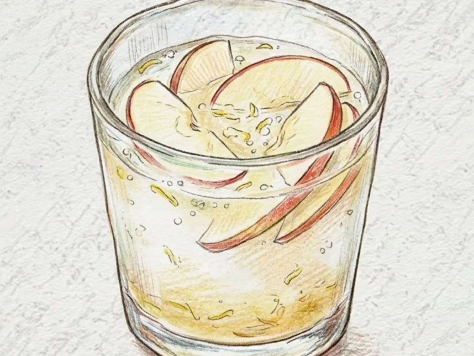 モドゥムファチェは、数種類の果物を角切りにして炭酸水とはちみつ水に浸して作る韓国式フルーツポンチです。りんごと梨はシャキシャキした食感を、青ぶどうは弾ける果汁をそれぞれ担い、果物ごとに大きさを揃えると食べるときの食感が均一になります。はちみつを冷水に溶いて果物の上に注ぐと、果物自体の果汁と混ざりながら自然な甘味が広がり、炭酸水の泡が果物の間から立ち上がって清涼感を加えます。氷をたっぷり入れて冷たく保つのがポイントで、夏の定番おやつドリンクです。