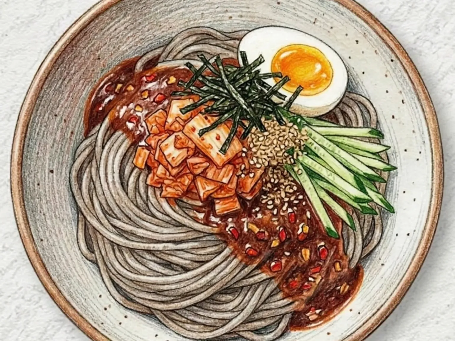 メミルマッグクスは、蕎麦麺の香ばしい穀物の風味に醤油、酢、唐辛子粉を混ぜた調味ダレを和えて甘酸っぱくピリ辛な味わいを出す江原道の代表的な麺料理です。蕎麦麺はグルテンが少ないため茹ですぎると切れやすく、茹で時間を正確に守ることが大切で、冷水で何度もすすいでデンプンを取り除くと麺同士がくっつきません。刻んだキムチが発酵の酸味とシャキシャキとした食感を加え、きゅうりの千切りが水分感と清涼な対比を生み出します。ごま油を一滴加えると調味ダレに香ばしいツヤがまとわれ、酢をお好みで追加すれば酸味の強さを自由に調整できます。