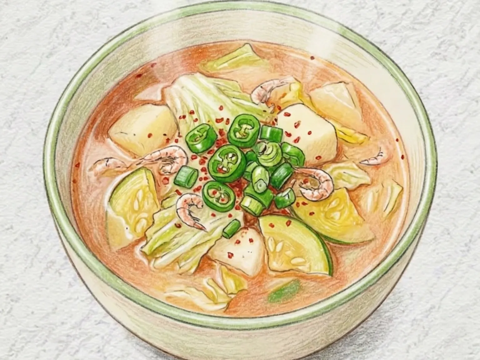 牛バラ肉と大根をごま油で炒めてから水を注いで煮込んだ、澄んですっきりとしたチゲです。薄口醤油で味を調え、長ねぎとにんにくで香りを整えて、材料はシンプルですが味わいは深いです。バラ肉から染み出した濃厚なスープに大根が透明に煮えて甘みを加えます。二日酔い覚ましが必要な時や、胃にやさしいスープ料理が恋しい時にご飯を入れて食べるのにぴったりの素朴な一品です。