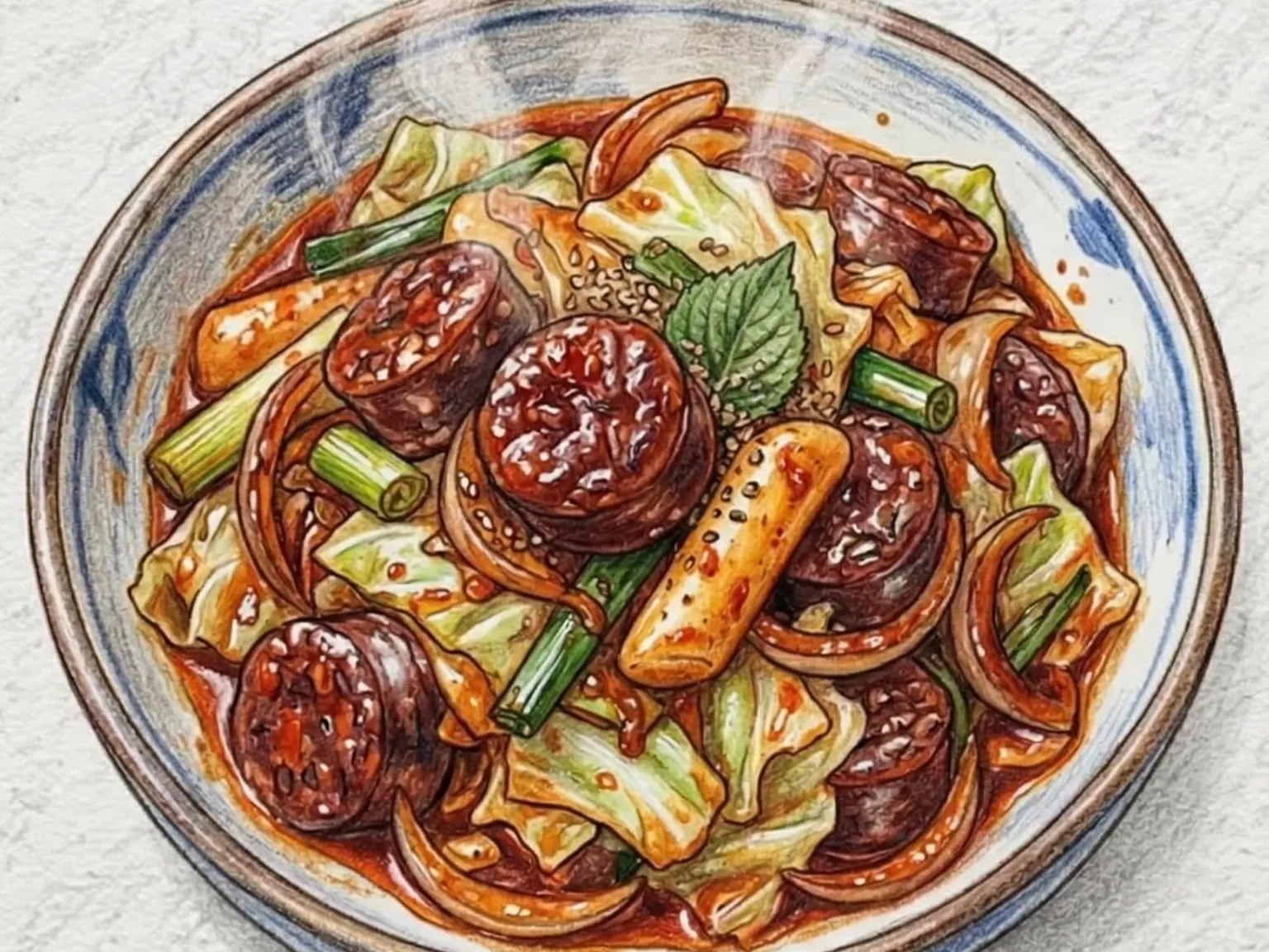 スンデ炒めは、スンデをキャベツ、玉ねぎ、長ねぎと一緒にコチュジャン、粉唐辛子、醤油、砂糖、にんにくで作ったタレで強火で素早く炒める粉食です。スンデは長く炒めると硬くなるため、強火で短時間のうちにタレを絡めるのがポイントです。キャベツと玉ねぎが熱でしんなりしながら水分を出し、タレが具材全体に均一に広がります。コチュジャンの直接的な辛味の上に粉唐辛子のほのかな辛味と砂糖の甘味が重なり、複合的な味わいを作り出します。長ねぎを最後に加えて香りを添え、トッポッキ用の餅を一緒に入れるとトッスニ(餅スンデ)にアレンジできます。