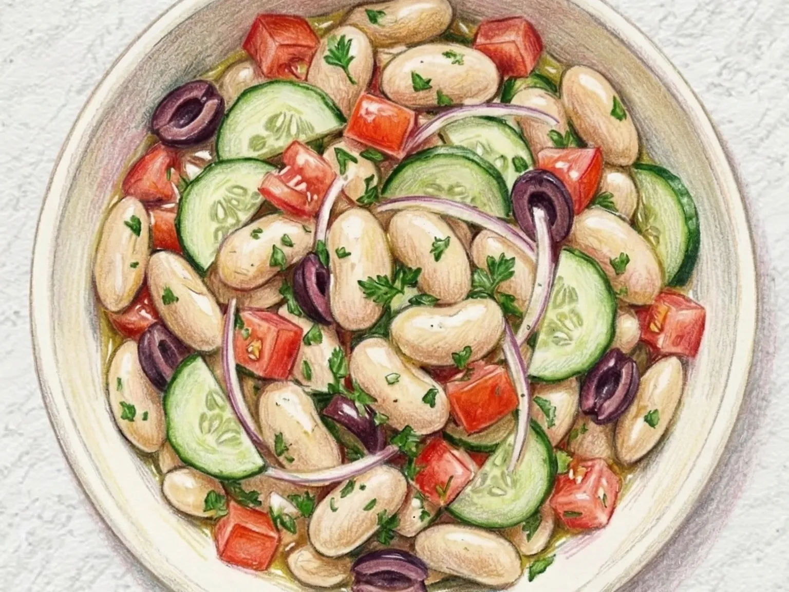 O feijão branco ancora esta salada com uma textura macia e ligeiramente farinhenta que proporciona saciedade real, enquanto o pepino e o tomate em cubos trazem umidade e acidez fresca para a base suave de leguminosas. As azeitonas pretas contribuem com uma profundidade salgada que combina naturalmente com o simples molho de limão e azeite, e a salsa picada finamente ilumina a tigela com fragrância de ervas. A cebola roxa é cortada fina o suficiente para que seu sabor permaneça sutil em vez de avassalador. A salada inteira não precisa de cozimento e fica pronta em quinze minutos; um curto descanso antes de servir permite que o feijão absorva o molho e desenvolva um sabor mais completo.